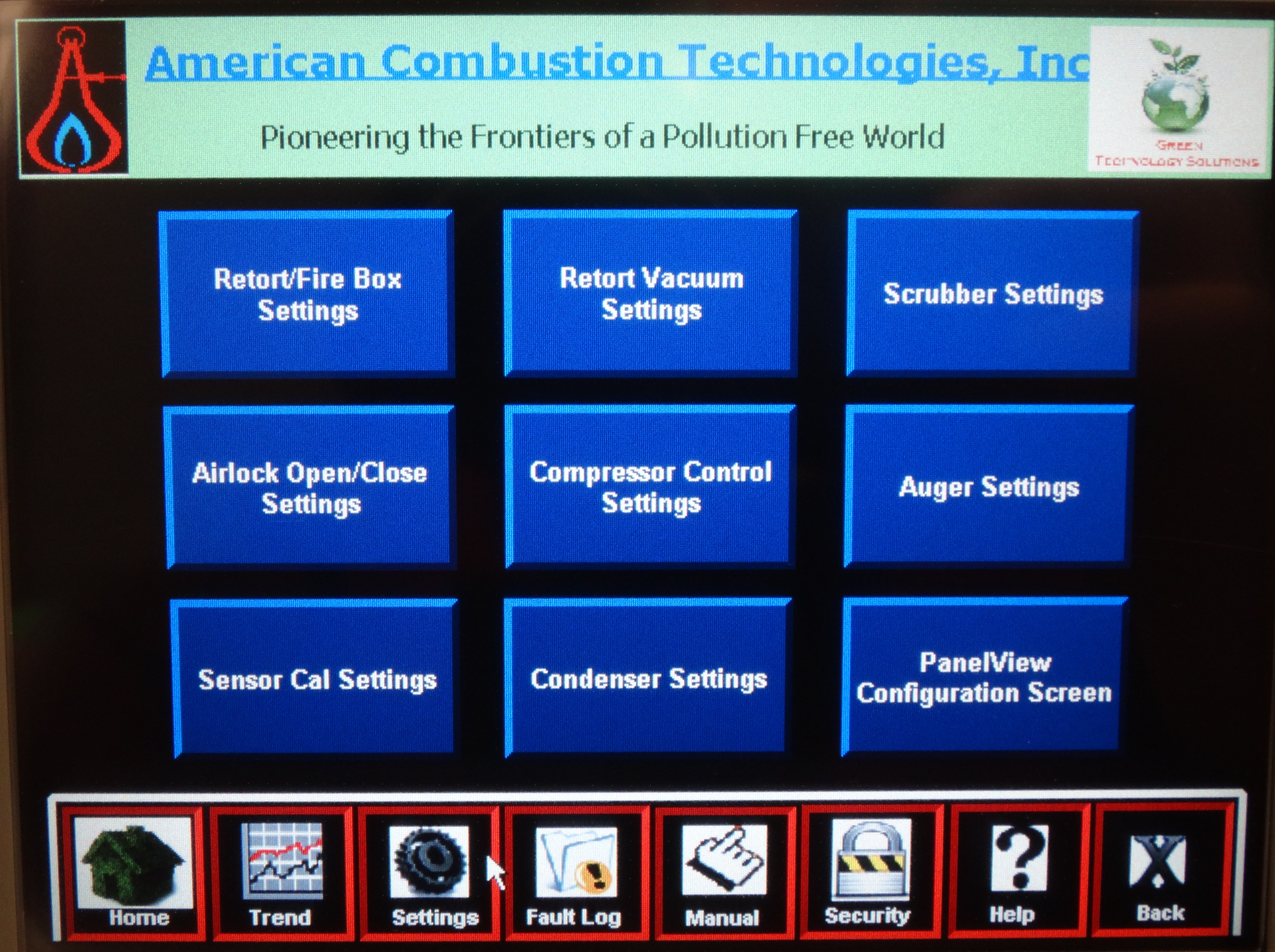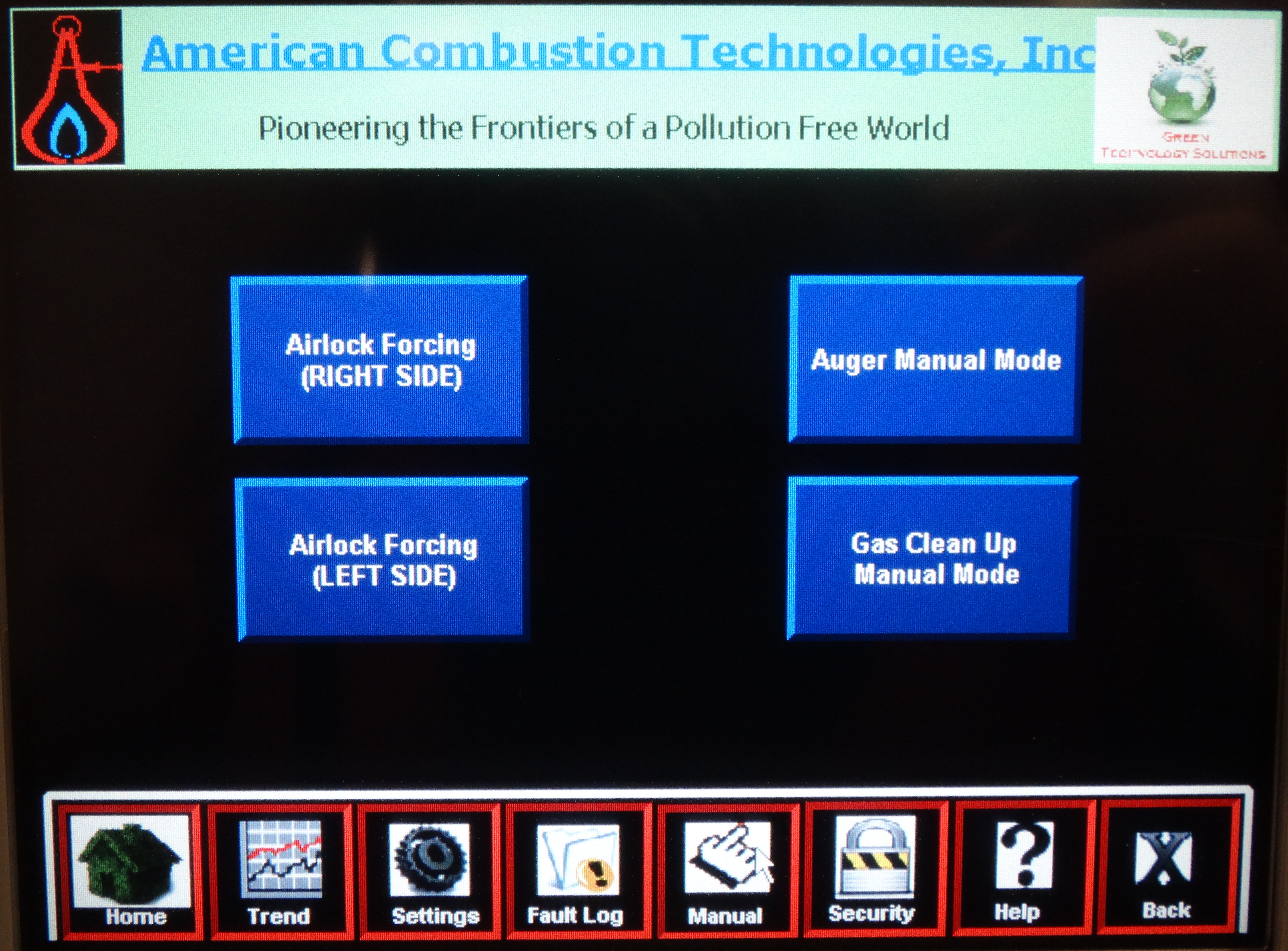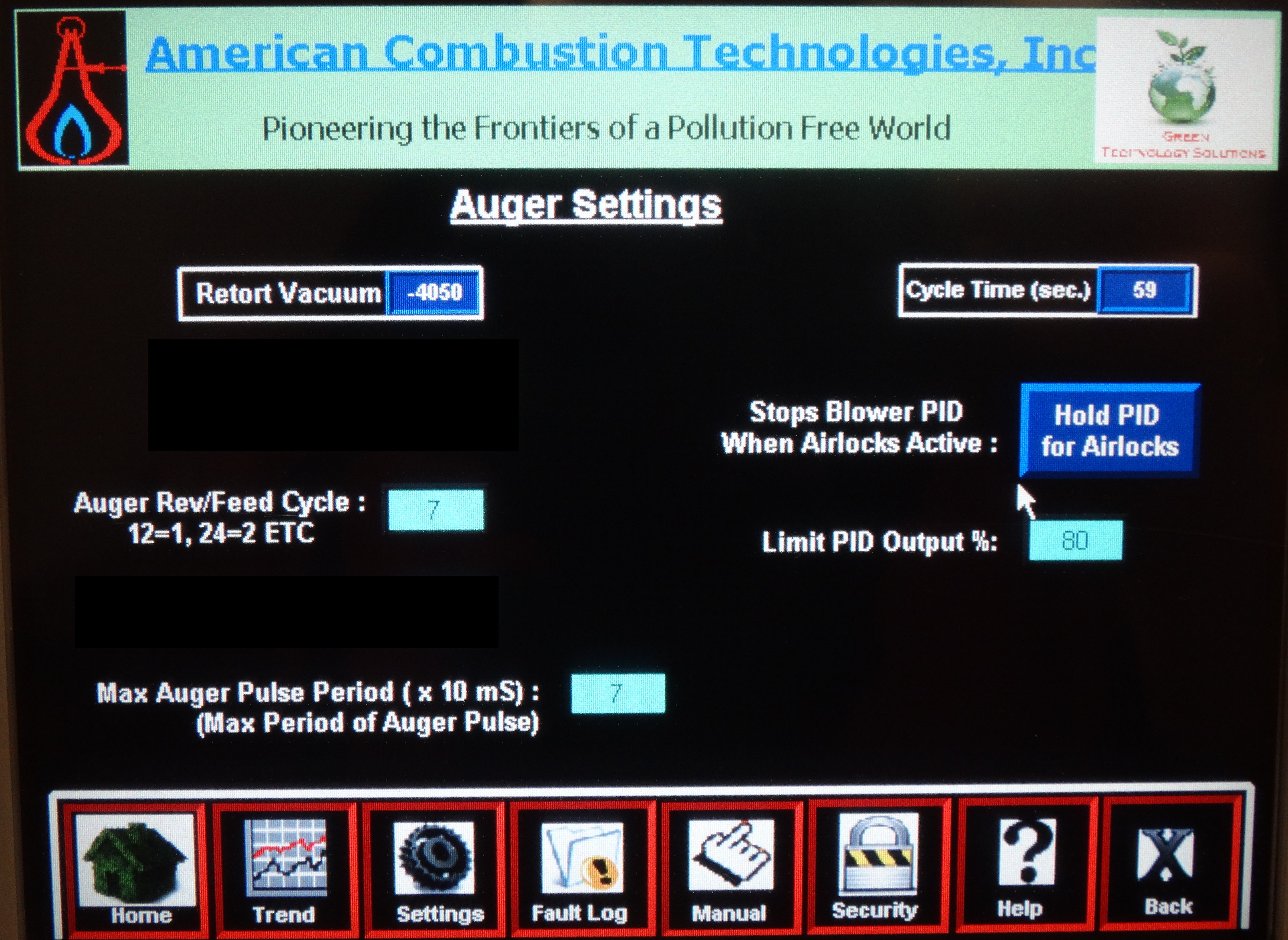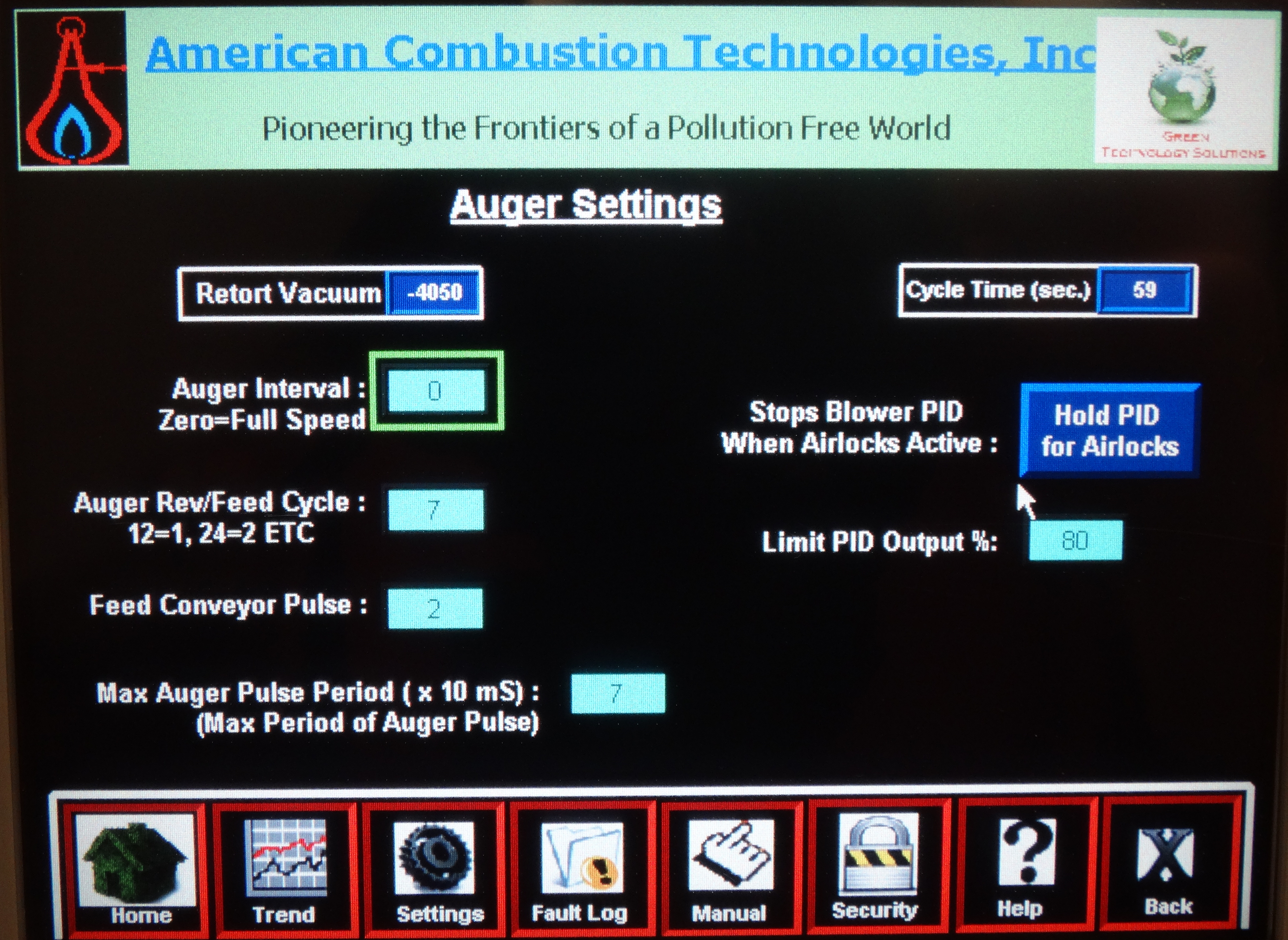 airlock left.JPG airlock open-close.JPG airock right.JPG auger manual.JPG auger settings.JPG auger settings-edit.jpg compressor setting.JPG condenser settings.JPG fault log.JPG home screen.JPG main screen.JPG mannual cleanup.JPG manual screen.JPG retort vac setting.JPG retort-firebox settings.JPG scrubber 2-3.JPG scrubber1.JPG sensor trims.JPG settings.JPG trend.JPG